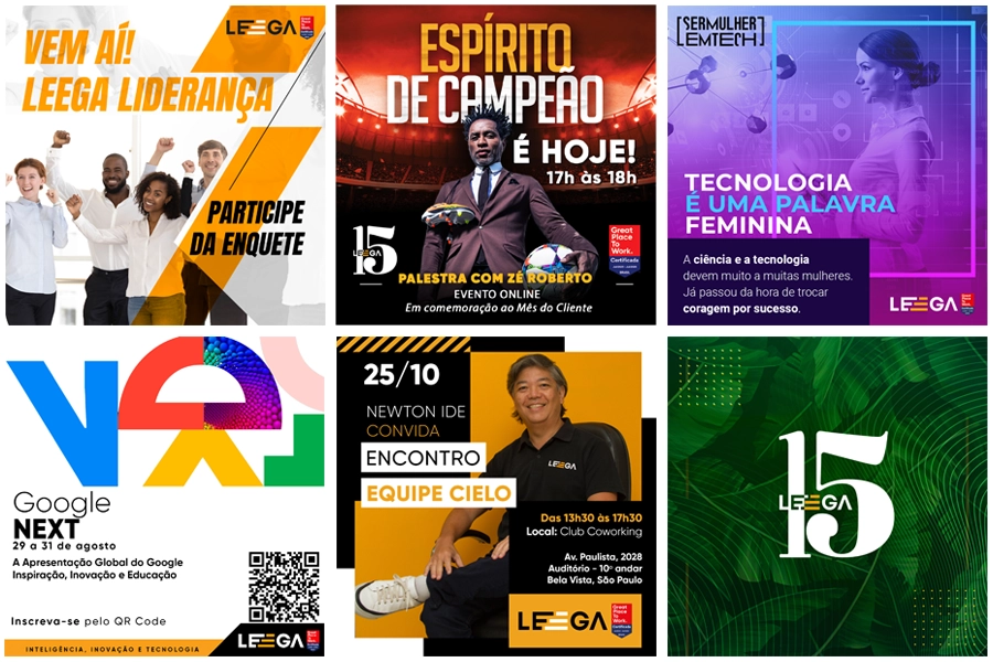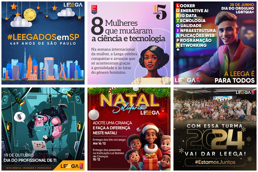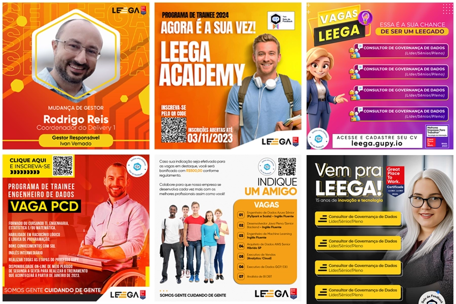 As artes desenvolvidas para as redes sociais da Leega foram pensadas para traduzir diferentes objetivos de comunicação em conteúdos visuais claros e consistentes. Campanhas, vagas, eventos, datas comemorativas e ações de conscientização foram estruturadas com identidade alinhada e uso estratégico de elementos visuais.